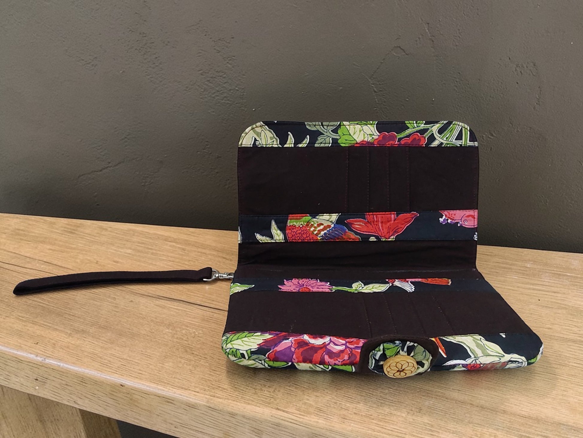 Bold, vibrant, and full of character — the Midnight Parrot Garden Wallet features a deep black base adorned with colorful tropical florals and a striking parrot motif. The rich contrast of lush greens, vivid reds, and soft floral tones creates a dramatic yet elegant statement piece.
