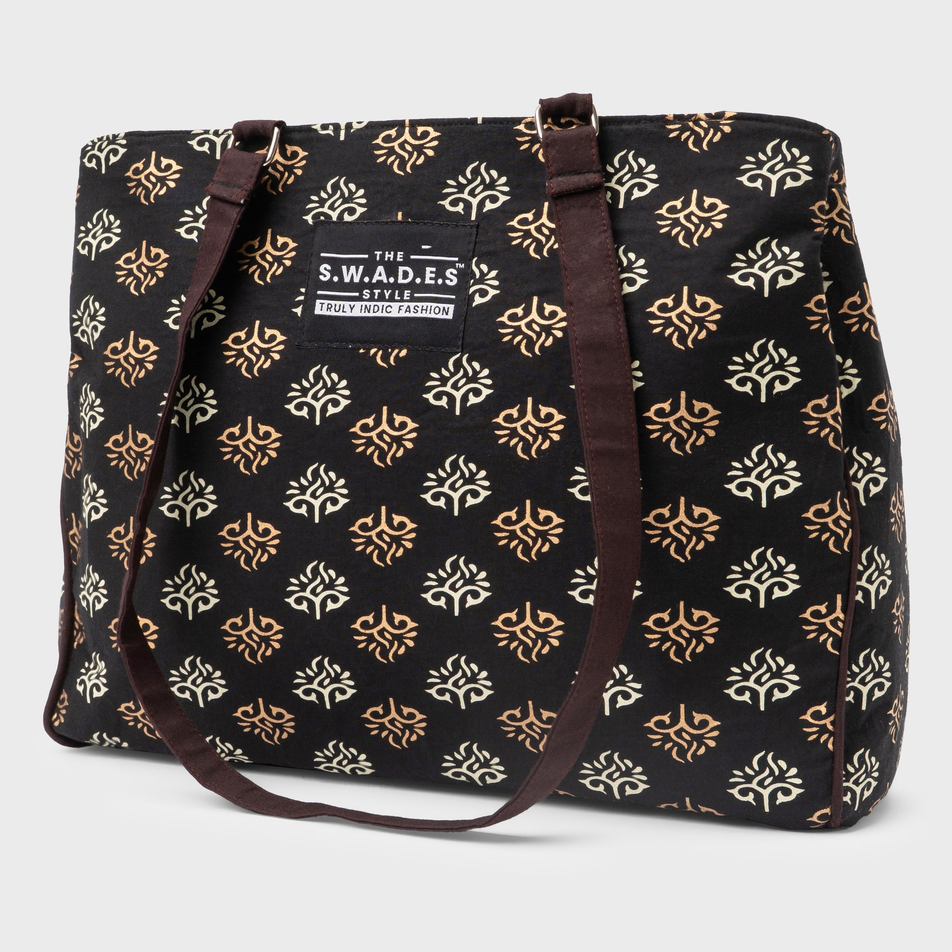 Graceful, grounded, and undeniably elegant — the Meher Tote from S.W.A.D.E.S is a tribute to India’s timeless design language. Featuring classic buti motifs in soft ivory and muted gold against a bold black canvas, this bag brings together heritage craftsmanship with a minimalist modern aesthetic.